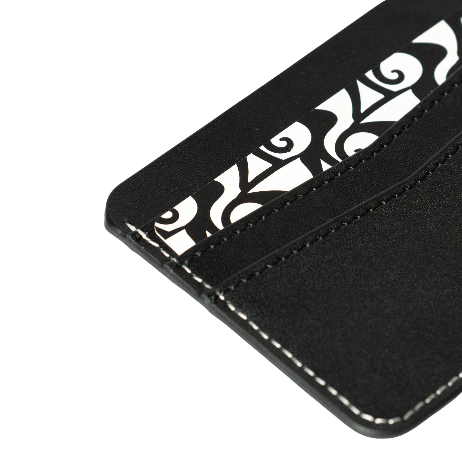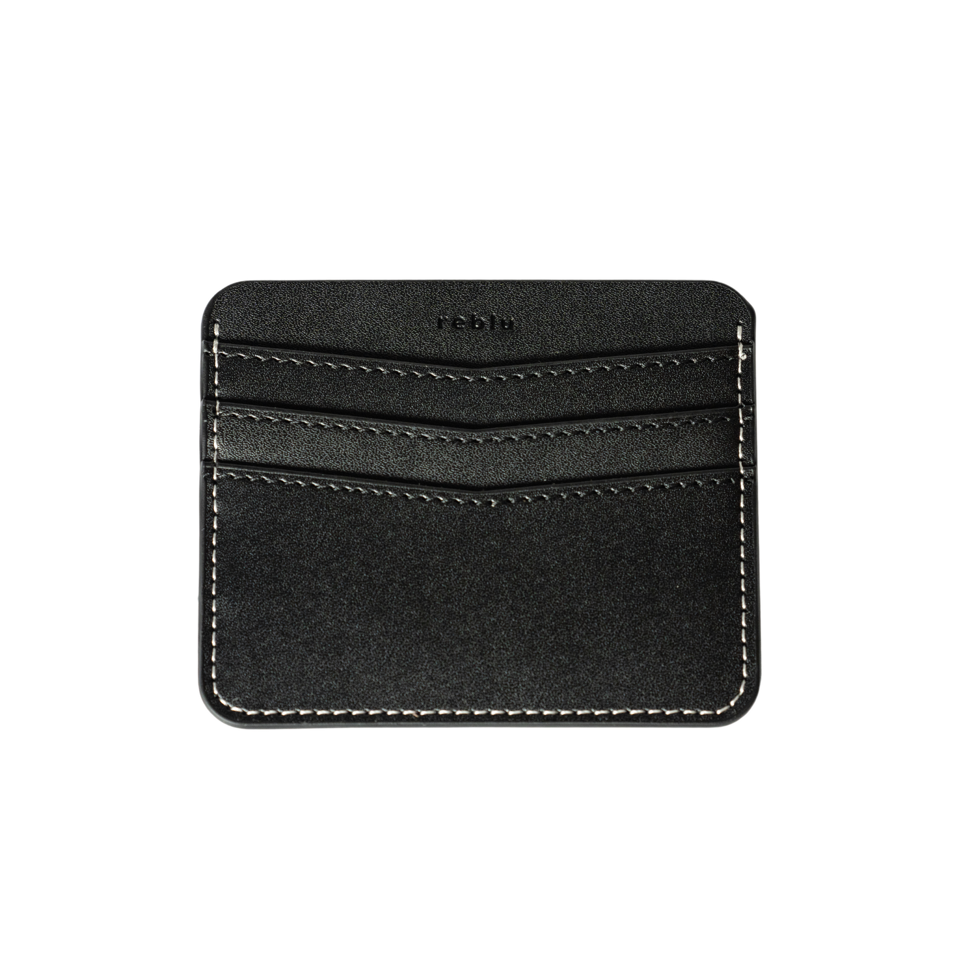 محفظة بطاقات مصنوعة من جلد أسود أنيق مع خياطة بيضاء متباينة لإضفاء لمسة راقية ومميزة
